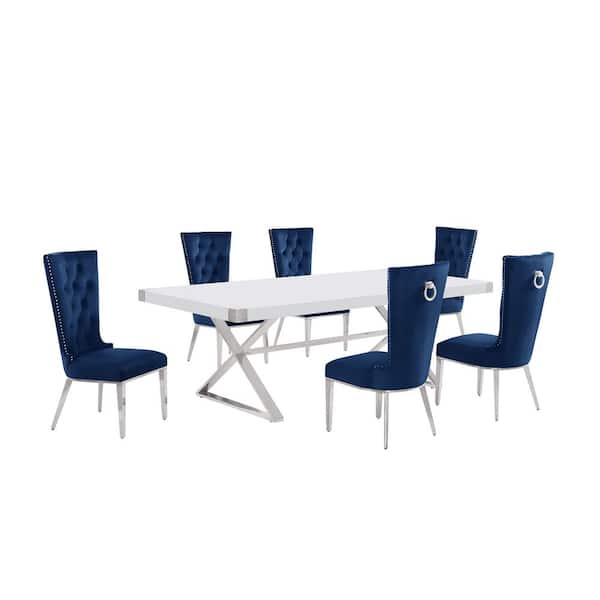 Miguel 7-Piece Rectangle White Wood Top Silver Stainless Steel Dining Set with 6 Navy Blue Velvet Chairs
