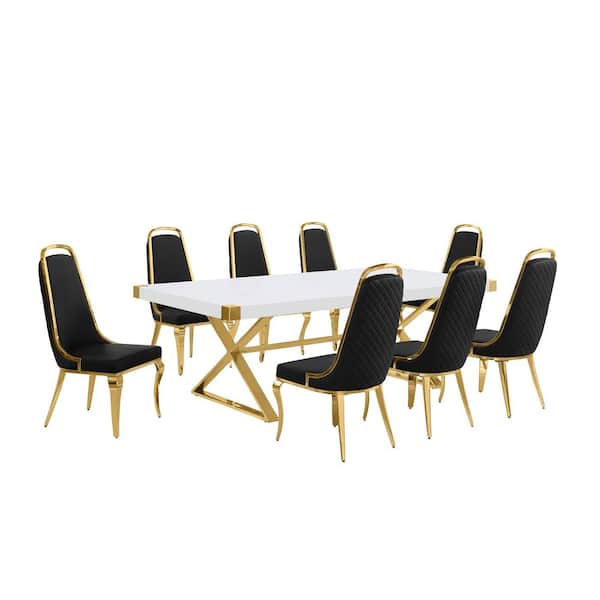 Miguel 9-Piece Rectangle White Wood Top Gold Stainless Steel Dining Set with 8 Black Chairs
