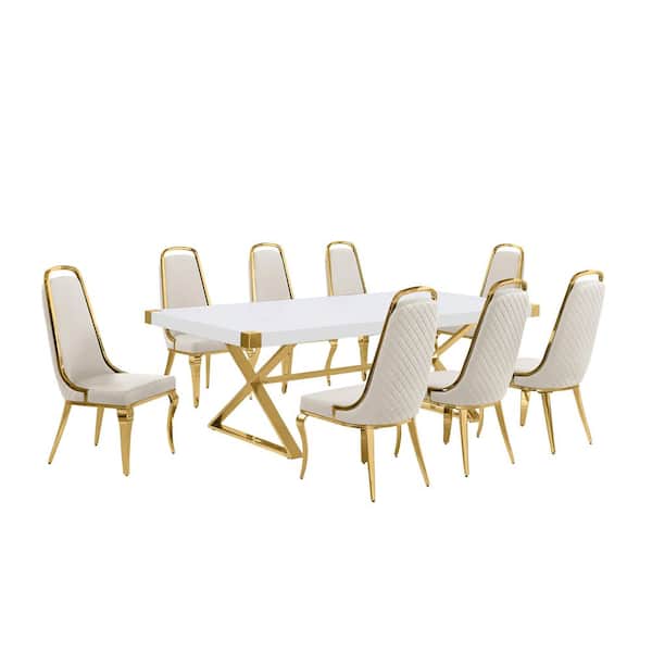 Miguel 9-Piece Rectangle White Wood Top Gold Stainless Steel Dining Set with 8 Cream Chairs