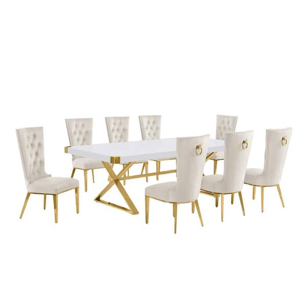 Miguel 9-Piece Rectangle White Wood Top Gold Stainless Steel Dining Set with 8 Cream Velvet Chairs