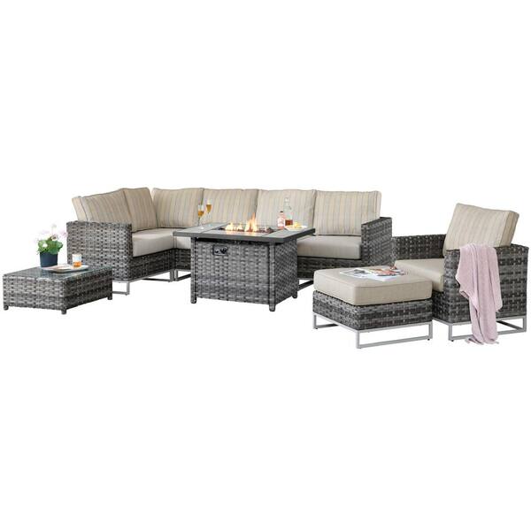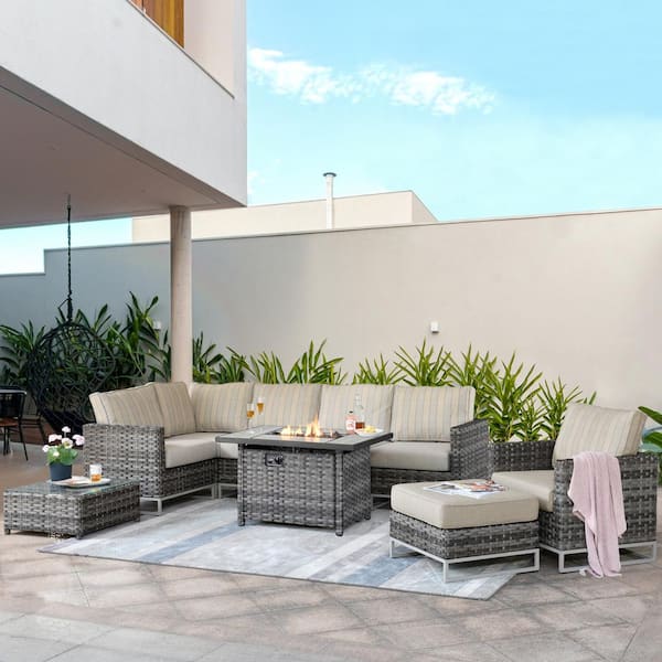 Mille Lacs Grey 9-Piece Wicker Outdoor Patio Fire Pit Conversation Sectional Sofa Set with Striped Beige Cushions