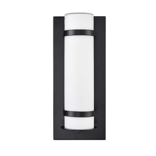 14 in. Wide 1-Light Powder Coated Black Hardwired Integrated LED Outdoor Cylinder Wall Sconce with White Glass