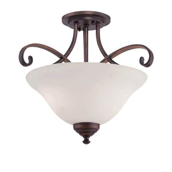 2-Light Rubbed Bronze Semi Flush Mount with Etched White Glass