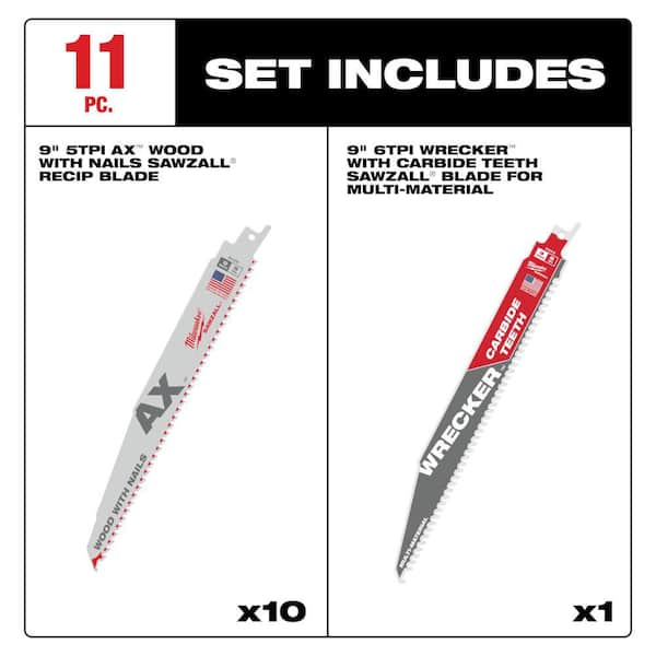 9 in. 5 TPI AX Nail-Embedded Wood Cutting SAWZALL Reciprocating Saw Blades (10-Pack) & 9 in. 6 TPI WRECKER Carbide Blade