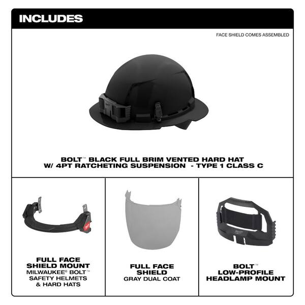 BOLT Black Type 1 Class C Full Brim Vented Hard Hat with 4-Point Ratcheting Suspension with Smoke Full Face Shield