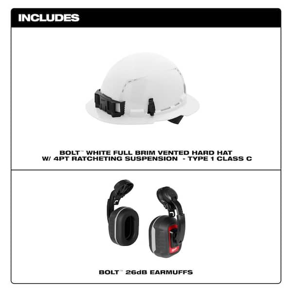 BOLT White Type 1 Class C Full Brim Vented Hard Hat with 4 Point Ratcheting Suspension W/BOLT HP Cap Mounted Ear Muffs