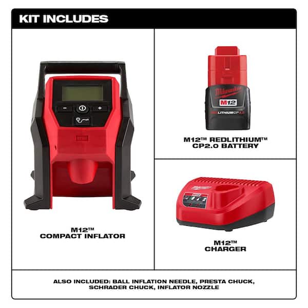 M12 12-Volt Lithium-Ion Cordless Compact Inflator with 2.0 Ah Battery and Charger & 100 Lumens Pen Light (2-Pack)