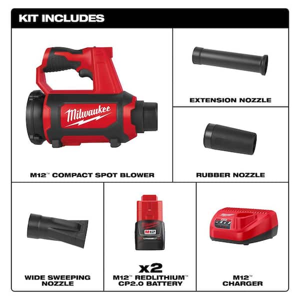 M12 12V Lithium-Ion Cordless Compact Spot Blower with M12 Compact 2.0 Ah Battery (2-Pack) Starter Kit and Charger