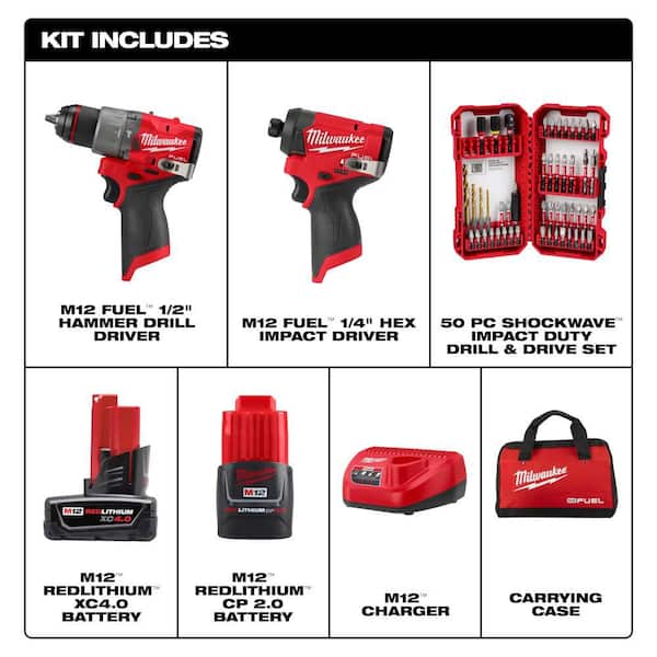 M12 FUEL 12-Volt Cordless Hammer Drill & Impact Driver Combo Kit with Impact Duty Driver Alloy Steel Bit Set (50-Piece)