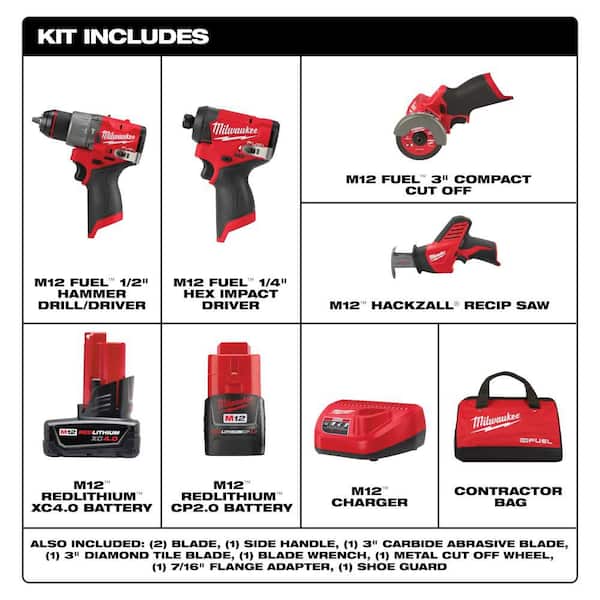 M12 FUEL 12-Volt Li-Ion Brushless Cordless Hammer Drill & Impact Driver Combo Kit w/2 Batteries, Cut Off Saw & Recip Saw
