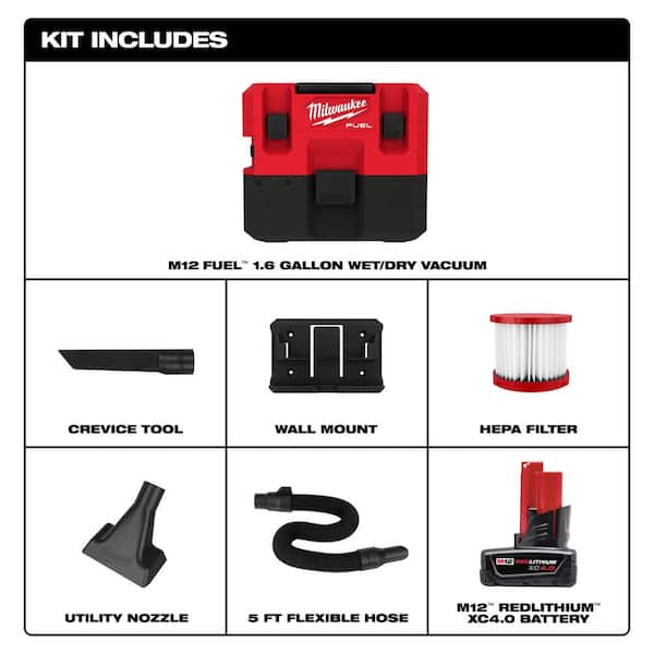 M12 FUEL 12-Volt Lithium-Ion Cordless 1.6 Gal. Wet/Dry Vacuum and M12 XC Extended Capacity Battery Pack 4.0Ah