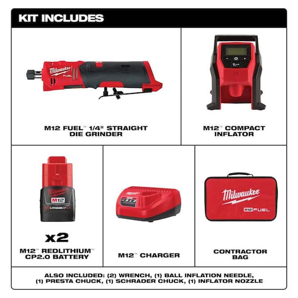 M12 FUEL 12V Lithium-Ion Brushless Cordless 1/4 in. Straight Die Grinder Kit w Two 2.0 Ah Batteries & M12 Inflator