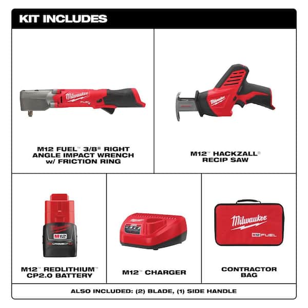 M12 FUEL 12V Lithium-Ion Brushless Cordless 3/8 in. Right Angle Impact Wrench Kit w Two 2.0 Ah Batteries & Recip Saw