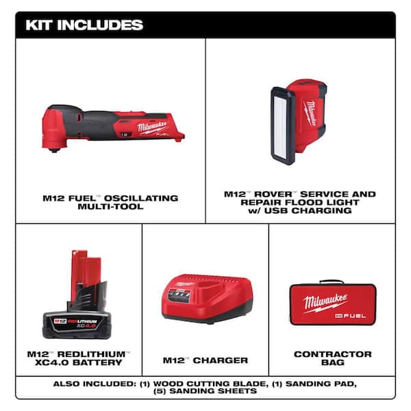 M12 FUEL 12V Lithium-Ion Cordless Oscillating Multi-Tool Kit w/ 4.0 Ah Battery, Charger, Accessories, Bag & ROVER Light