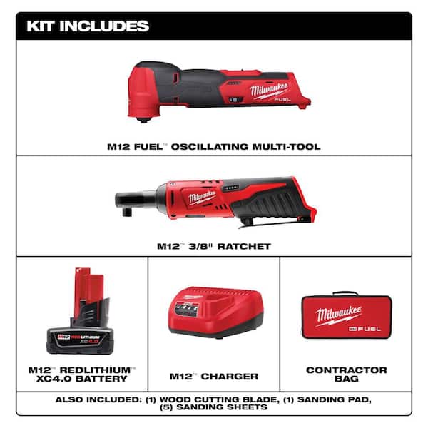 M12 FUEL 12V Lithium-Ion Cordless Oscillating Multi-Tool Kit w 4.0Ah Battery, Charger, Accessories, Bag & 3/8 in Ratchet
