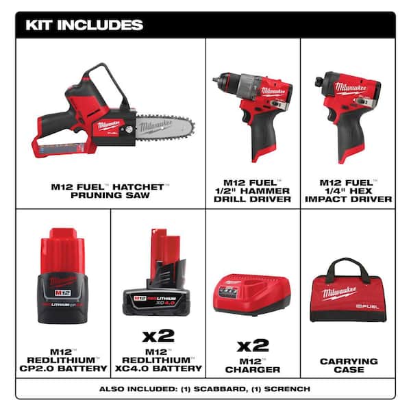 M12 FUEL 6 in. 12V Lith-Ion Brushless Electric Battery Chainsaw Saw HATCHET Kit with M12 FUEL Hammer Drill & Impact Kit