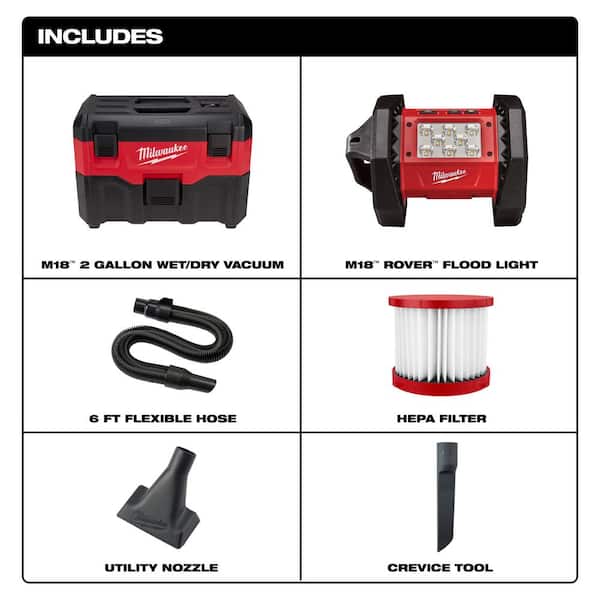 M18 18-Volt 2 Gal. Lithium-Ion Cordless Wet/Dry Vacuum with M18 Rover 18-Volt Lithium-Ion 1500 Lumens LED Flood Light