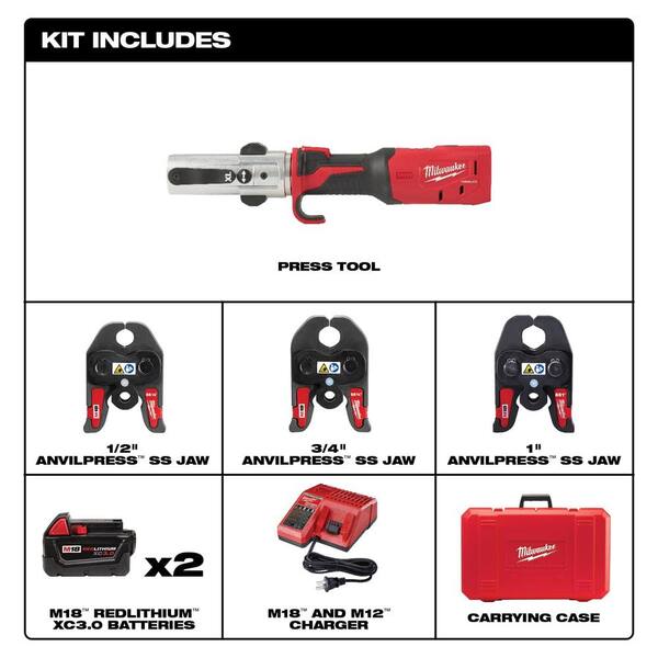M18 18-Volt Lithium-Ion 1/2 in. to 1 in. FORCE LOGIC Long Throw Cordless Press Tool Kit w/ 3 Jaws, (2) 3.0 Ah Batteries