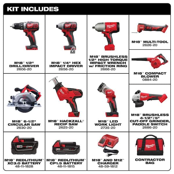 M18 18-Volt Lithium-Ion Cordless Combo Kit 9-Tool with 2-Batteries, Charger and Tool Bag