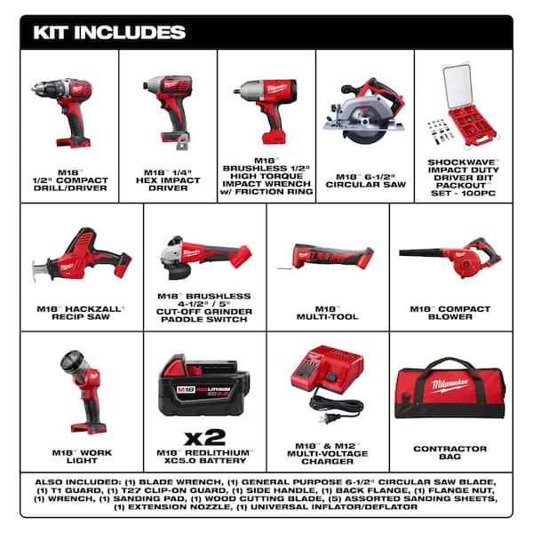 M18 18V Lith-Ion Cordless Combo Kit (9-Tool) with (2) Batteries, Charger & SHOCKWAVE Screw Driver Bit Set (100-Piece)
