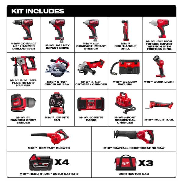 • Includes:16 tools, (4) m18 battery, (1) 6 pk sequential charger