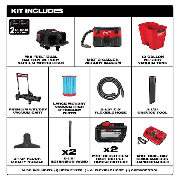 M18 FUEL 12 Gal. Cordless Dual-Battery Wet/Dry Shop Vac Kit & M18 2 Gal Wet/Dry Vac