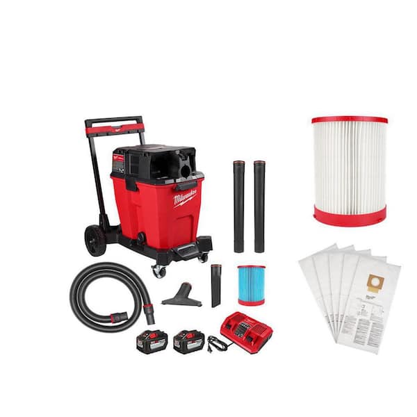 M18 FUEL 12 Gal. Cordless Dual-Battery Wet/Dry Shop Vac Kit with HE Filter, HEPA Filter and (5-Pack) Fleece Dust Bags