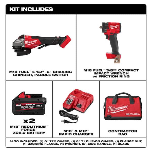 M18 FUEL 18-Volt Lith-Ion Cordless 4-1/2 in. /6 in. Braking Grinder w/ Two XC 8.0 Ah Battery & 3/8 in. Impact Wrench