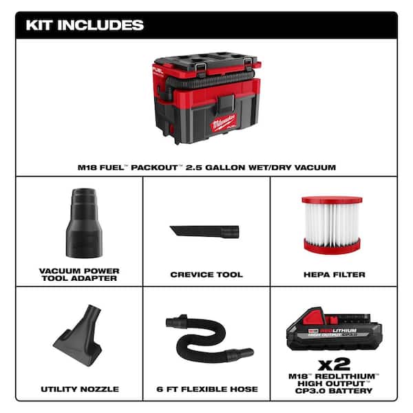 M18 FUEL PACKOUT 18-Volt Lithium-Ion Cordless 2.5 Gal. Wet/Dry Vacuum with 2 M18 HIGH OUTPUT 3.0 Ah Batteries