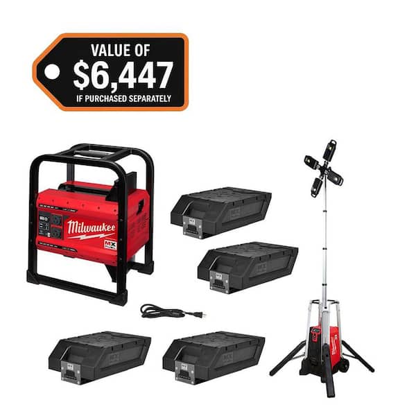 MX FUEL 3600-Watt/1800-Watt Push Start Battery Powered Generator & Rocket Stand Light with 4 XC Batteries and Charger
