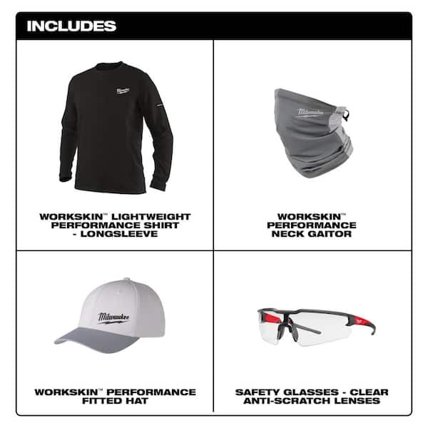 Men's WORKSKIN Small Black Long Sleeve T-Shirt with Small/Medium Gray WORKSKIN Hat, Gray Gaiter and Clear Safety Glasses