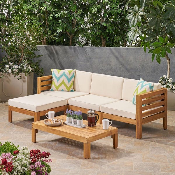 Anky 5-Piece Wood Patio Conversation Sectional Seating Set with Beige Cushions, with Ottoman and Coffee Table