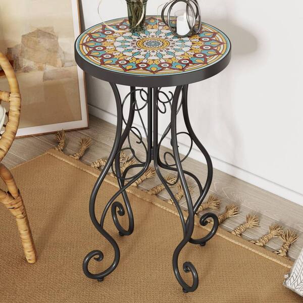 Anky Black, Colorful Round Ceramic Tile plus Iron 22.44 in. H Outdoor Side Table