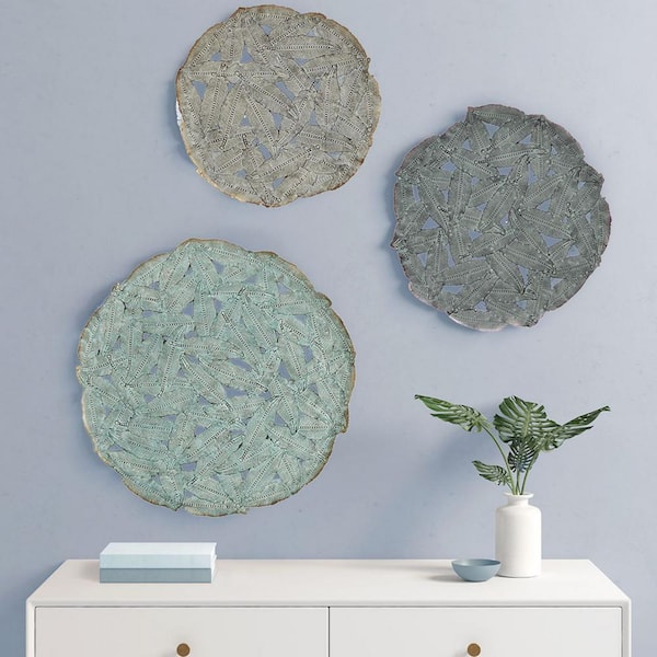 Anky Metal Blue Textured Feather 3-Piece Metal Disc Wall Decor Set
