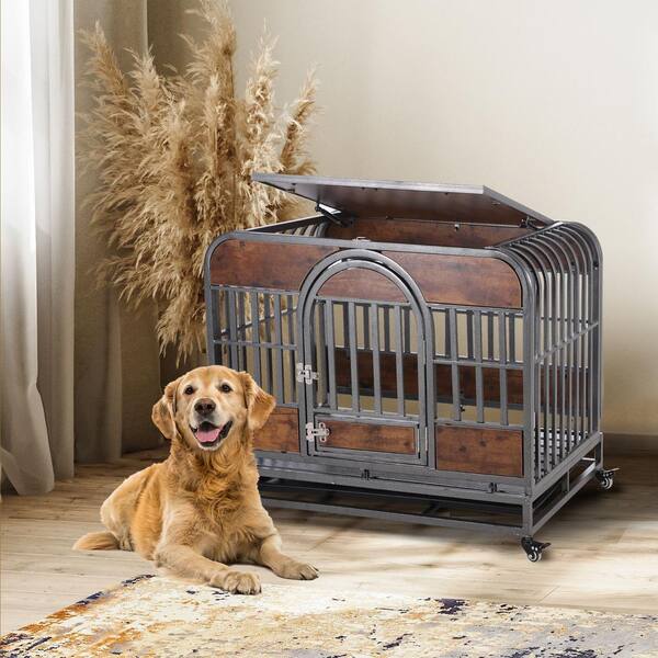 Any 37 in. W Heavy-Duty Dog Crate, Furniture Style Dog Crate Removable Trays and Wheels for High Anxiety Dogs in Brown