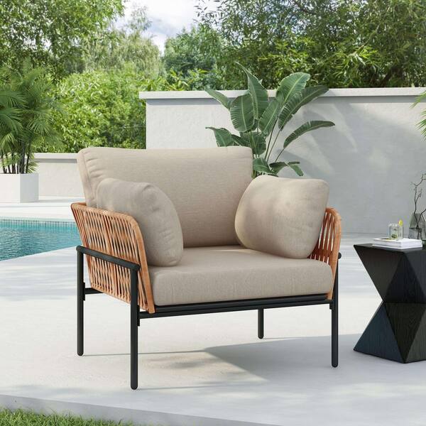 Avex Natural Rope Weave Iron Outdoor Lounge Chair with Beige Cushions