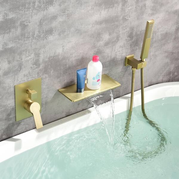 Poo Single-Handle Wall Mount Roman Tub Faucet with Hand Shower in Brushed Gold (Valve Included)