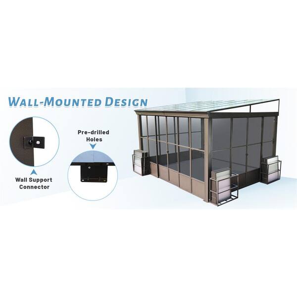 10 ft. x 14 ft. Dark Brown Outdoor Gazebo Permanent Wall Mounted with Detachable Windows and 2-Lockable Sliding Doors