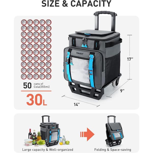 32 qt. 30L Rolling Cooler with 16Hrs Ice Retention Retractable Handle All-Terrain Tires Waterproof Soft Cooler Bag