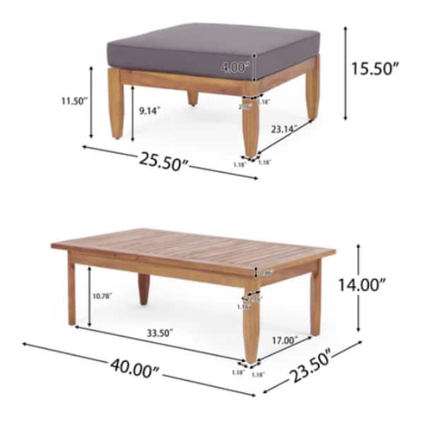 Mid-Century Modern Design Acacia Wood Outdoor Ottoman with Slat Panel Style Coffee Table in Water-Resistant Gray Cushion