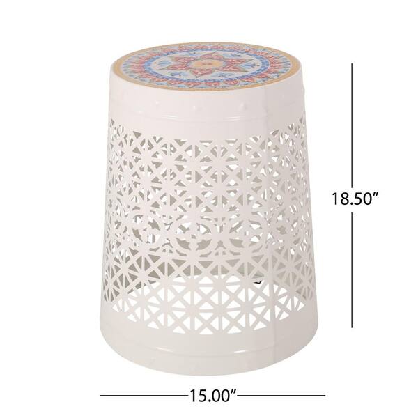 White Round Powder-Coated Metal 18.50 in. Outdoor Accent Side Table with Gorgeous Tile Mosaic Design