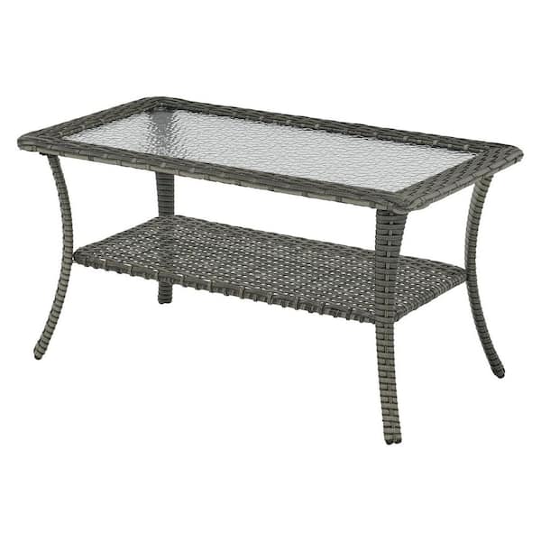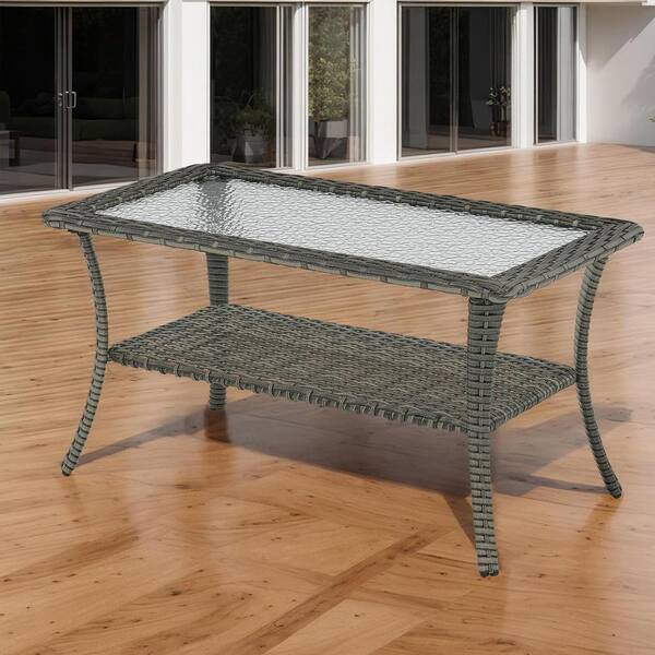 Mixed Grey Wicker Outdoor Coffee Table with 2-Tier Storage Shelf Glass Top
