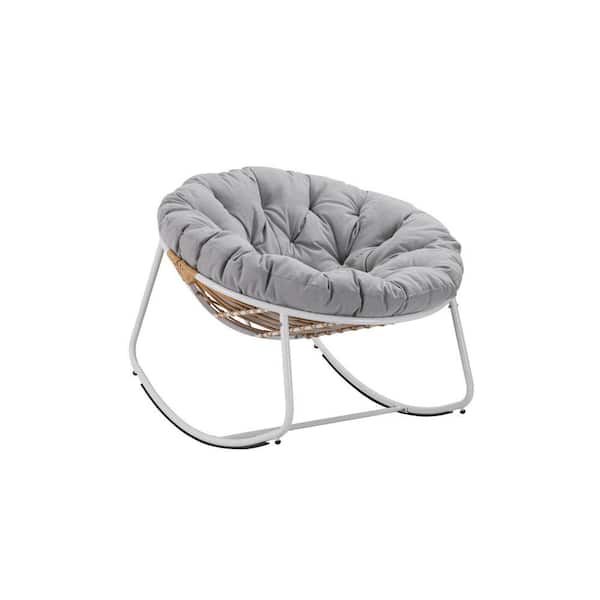Modern 1-Piece Metal White Round Rattan Rope Club Outdoor Rocking Chair with Light Gray Cushion