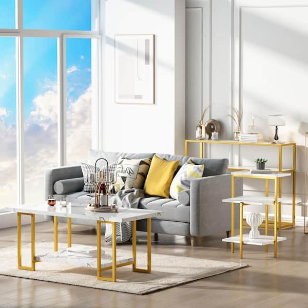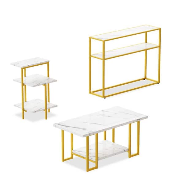 Modern 3-Piece White Rectangle Faux Marble Top Coffee Table Set Included Console Table, Coffee Table and End Table