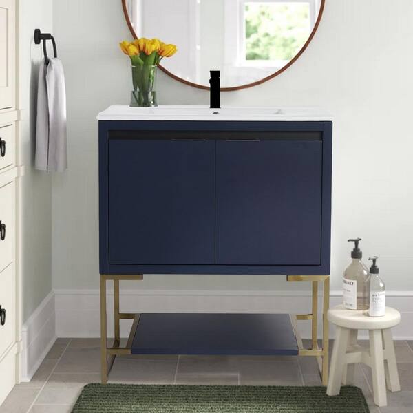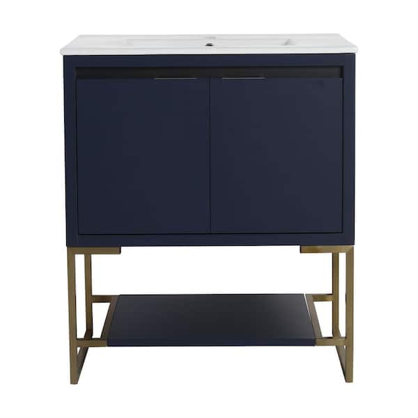 Modern 30 in. W x 18 in. D x 35 in. H Freestanding Bath Vanity in Navy Blue with White Ceramic Sink and Top