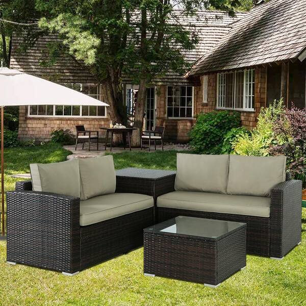 Modern 4-Piece Brown Wicker Outdoor Patio Conversation Sectional Set with Khaki Cushions