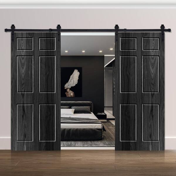 Modern 6-Panel Designed 60 in. W. x 80 in. Wood Panel Ebony Painted Double Sliding Barn Door with Hardware Kit