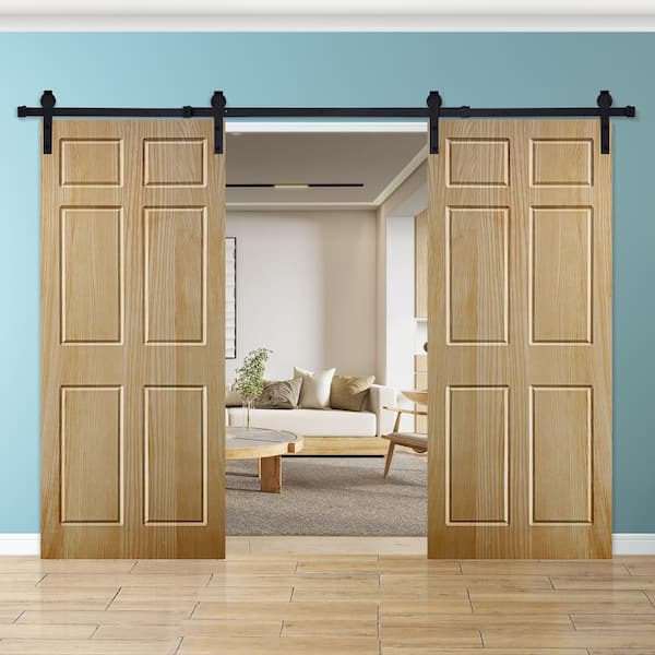Modern 6-Panel Designed 60 in. W. x 80 in. Wood Panel Mother Nature Painted Double Sliding Barn Door with Hardware Kit