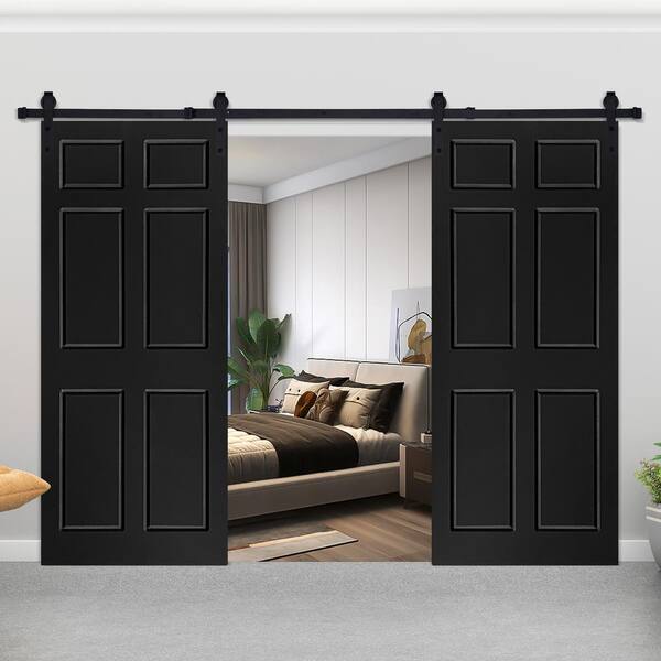 Modern 6-Panel Designed 60 in. x 80 in. MDF Panel Black Painted Double Sliding Barn Door with Hardware Kit