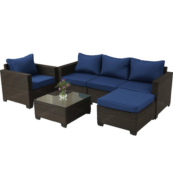 Modern 6-Piece Brown Wicker Patio Outdoor Sofa Conversation Seating Set with Dark Blue Cushions and Slope Back